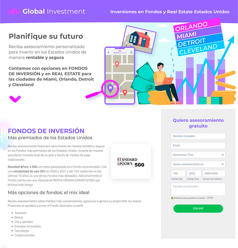 ZonaVip creo este poderoso servicio de Email Marketing para generar nuevos prospectos y ventas. Global Investment es nuestra unidad de negocio dedicada a promocionar servicios financieros de Fondos de Inversión y Real Estate en los Estados Unidos.